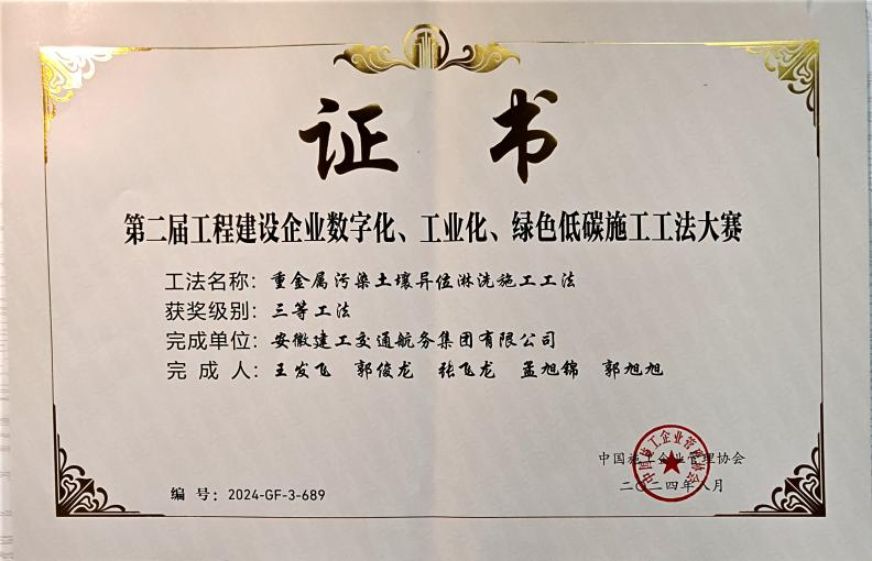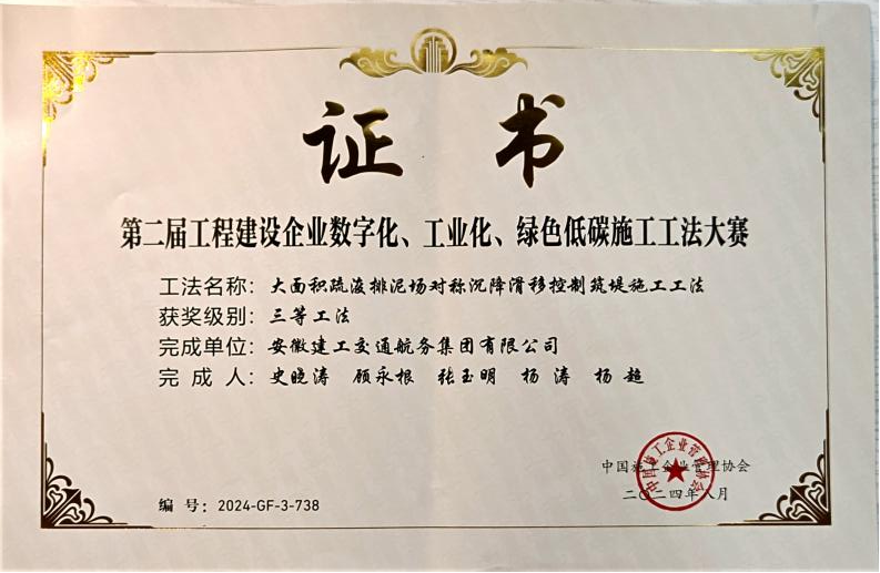 在工程建設(shè)企業(yè)“數(shù)字化、工業(yè)化、綠色低碳”施工工法大賽中,公司申報(bào)的“城市內(nèi)河航道入湖口生態(tài)濕地修復(fù)施工工法”、“自浮裝配式土工管袋充灌操作平臺與隔污系統(tǒng)施工工法”、“重金屬污染土壤異位淋洗施工工法”、“大面積疏浚排泥場對稱沉降滑移控制筑堤施工工法”分別榮獲一等獎、二等獎、三等獎。