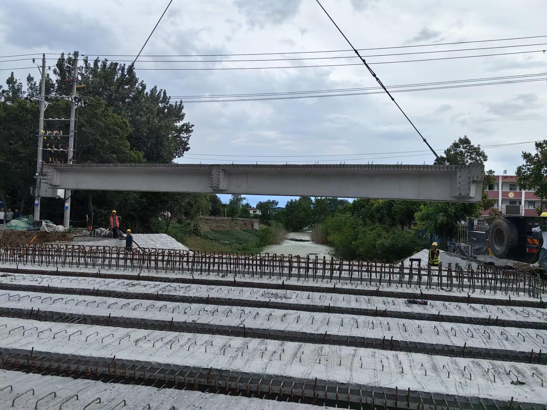 6月14日9時20分,S318阜南中崗至苗集段改建工程張古橋施工現(xiàn)場,130噸吊機將16米長、21噸重的首片預(yù)制T梁精準落位,標志著項目橋梁工程進入上部結(jié)構(gòu)施工沖刺階段。