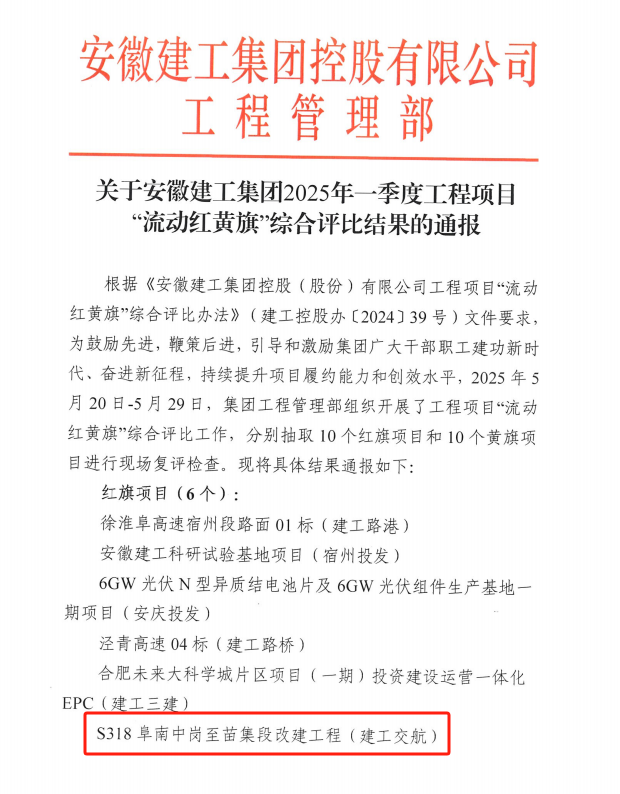 近日,安徽建工集團公布2025年一季度工程項目“流動紅黃旗"評比結果,建工交航市政工程公司(王家壩建投)承建的S318阜南中崗至苗集段改建工程獲評“紅旗項目”。
