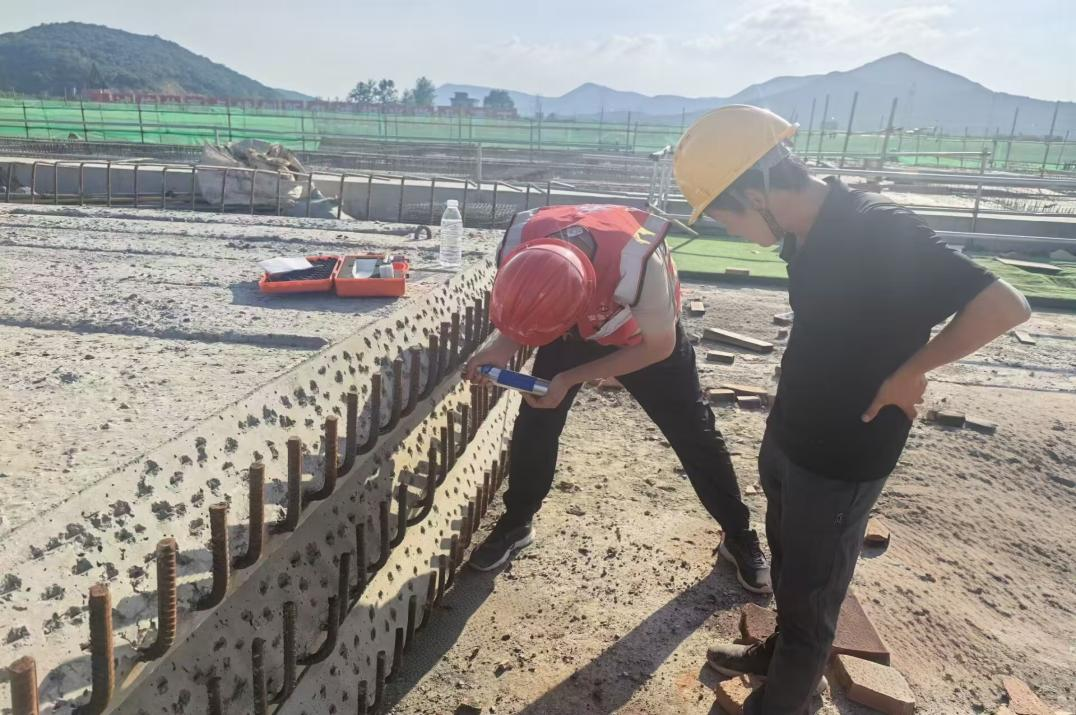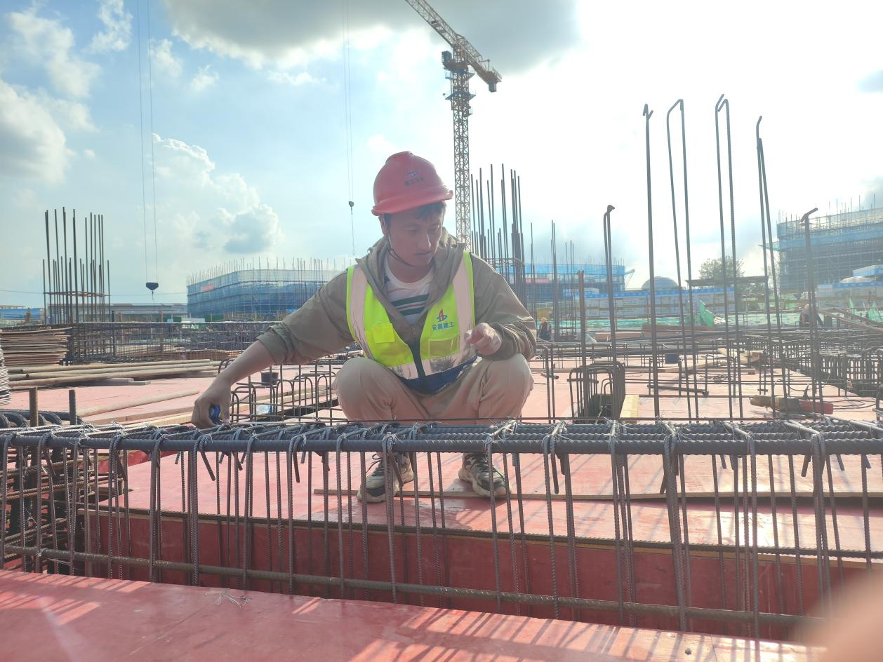 利辛縣科教推廣中心項(xiàng)目頂板上,鋼筋在烈日下被曬得燙手。施工員陳滿滿俯身其間,卷尺緊貼滾燙的鋼筋,逐點(diǎn)核查間距、綁扎質(zhì)量與保護(hù)層厚度。他認(rèn)真查看每個(gè)節(jié)點(diǎn),往復(fù)丈量,一絲不茍記錄數(shù)據(jù)。